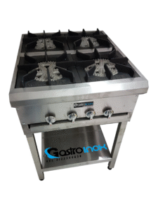 Estufa industrial de cuatro puestos a gas, diseñada con un estilo moderno y funcional. Ideal para cocinas profesionales que requieren alto rendimiento y eficiencia en la preparación simultánea de múltiples platos. Su estructura robusta permite el uso continuo con ollas de gran tamaño, ofreciendo estabilidad, distribución uniforme del calor y una altura de trabajo cómoda para el operario.
